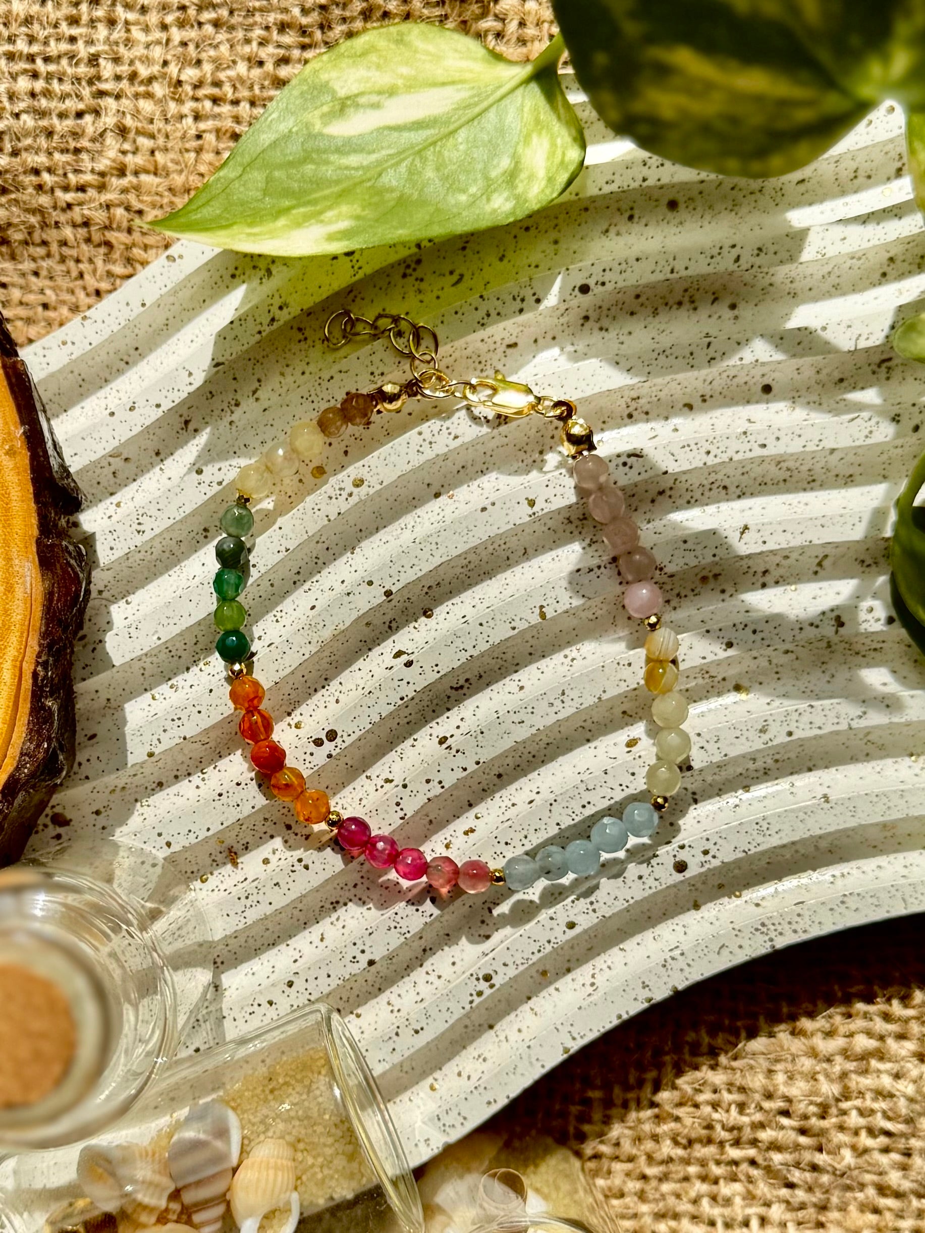 This bracelet set consists of two simple-style bracelets crafted from agate stone, hematite stone, and gold-plated stainless steel. The bracelets feature a variety of colors, including gold, yellow, green, orange, pink, and light-blue. They are secured with a lobster claw clasp and are designed for comfort and practicality with an adjustable fit. Each bracelet is handmade, making them unique, and they are suitable for everyday wear.