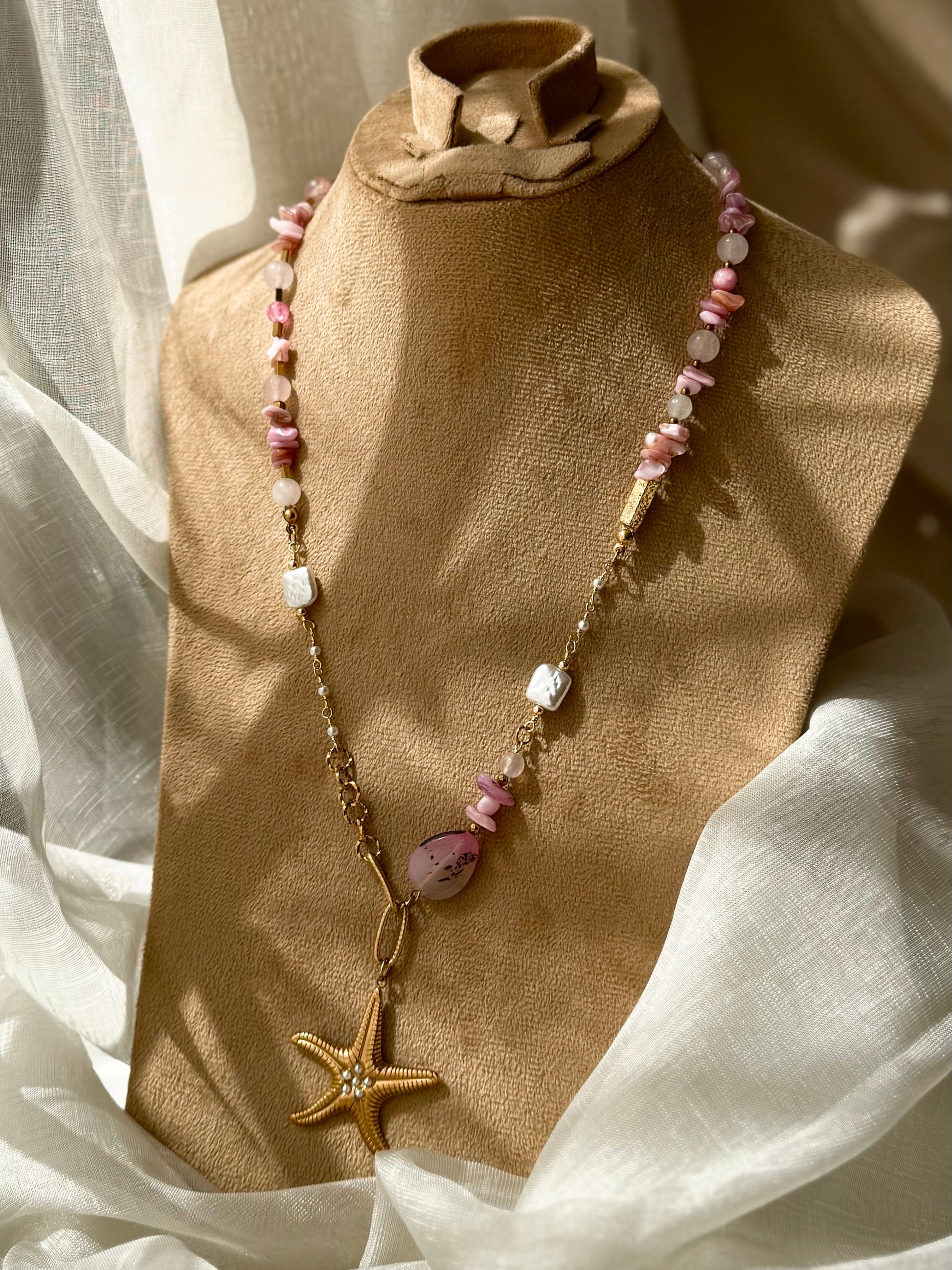 To keep your necklace shining, avoid contact with water, perfumes, and harsh chemicals. Store in a dry place when not in use.