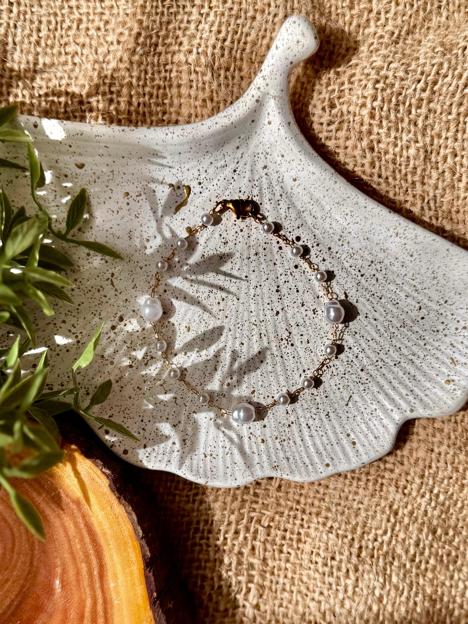 This bracelet set consists of five chunky and trendy pieces, crafted from a variety of materials including agate stone, chip stone, hematite stone, gold-plated stainless steel, and Majorca Pearls. The bracelets feature a color palette of gold, white, and beige, offering a versatile look suitable for everyday wear. Designed for comfort and practicality, each bracelet is adjustable to fit different wrist sizes. The entire set is handmade, showcasing a unique and artisanal touch.